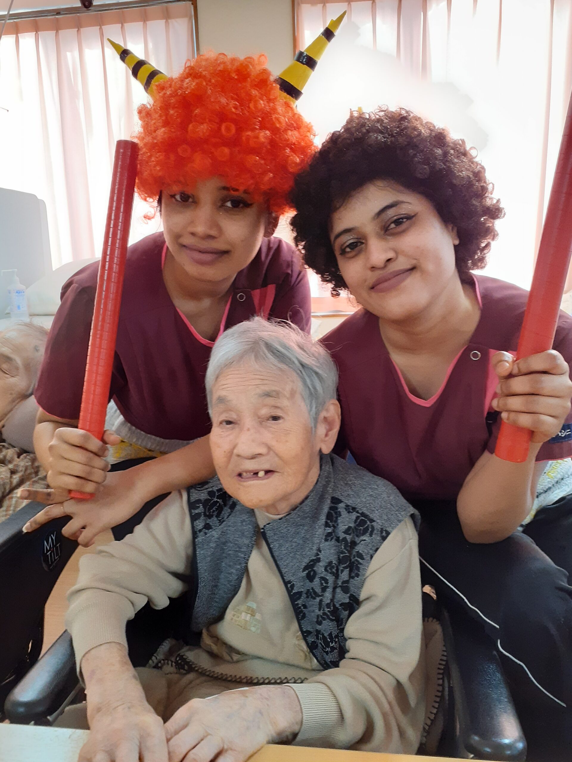 2人の鬼が登場し、豆替わりのボールにて利用者様に「鬼は外」「福は内」と言う掛け声と共に投げて頂きました!
