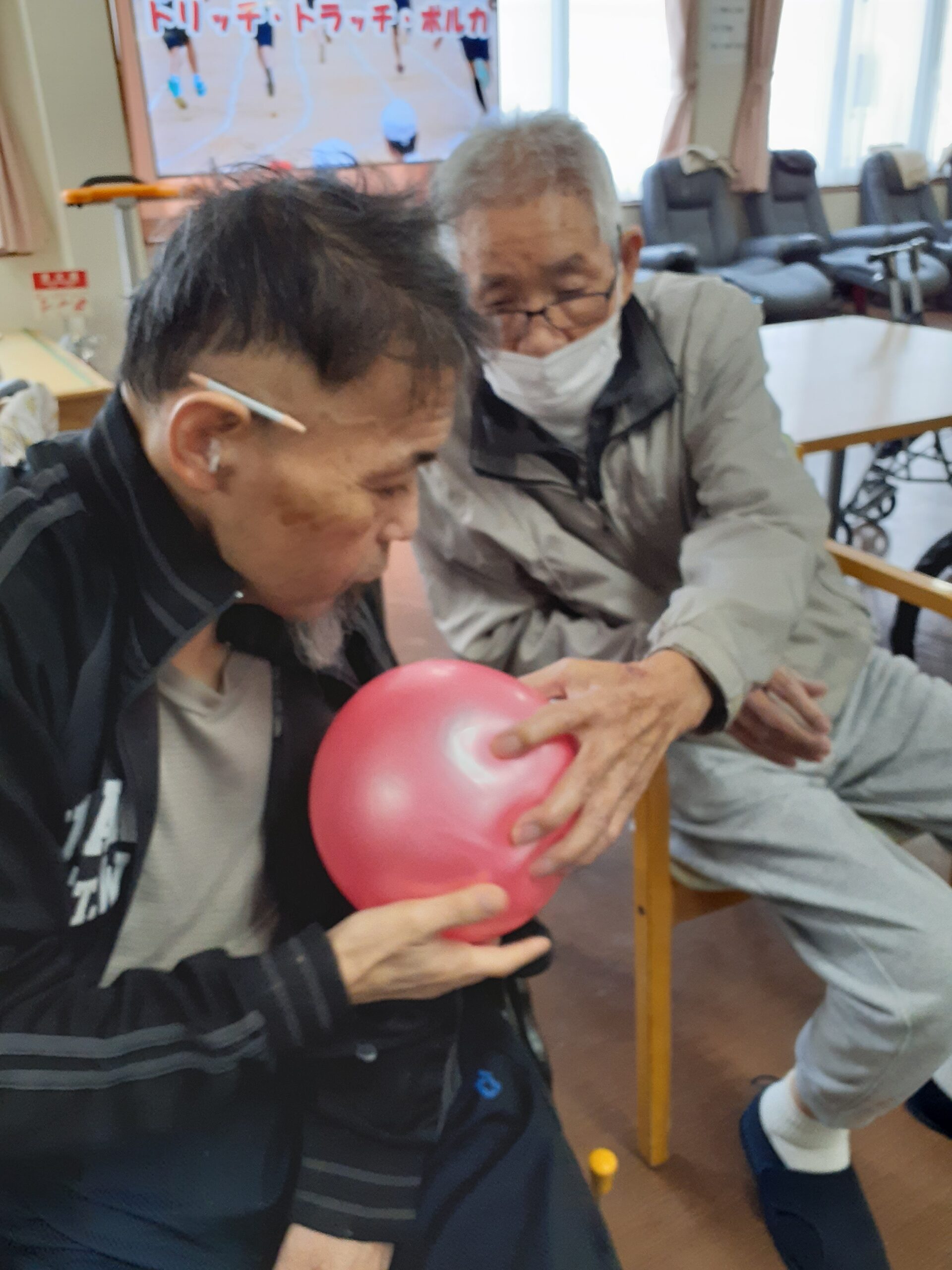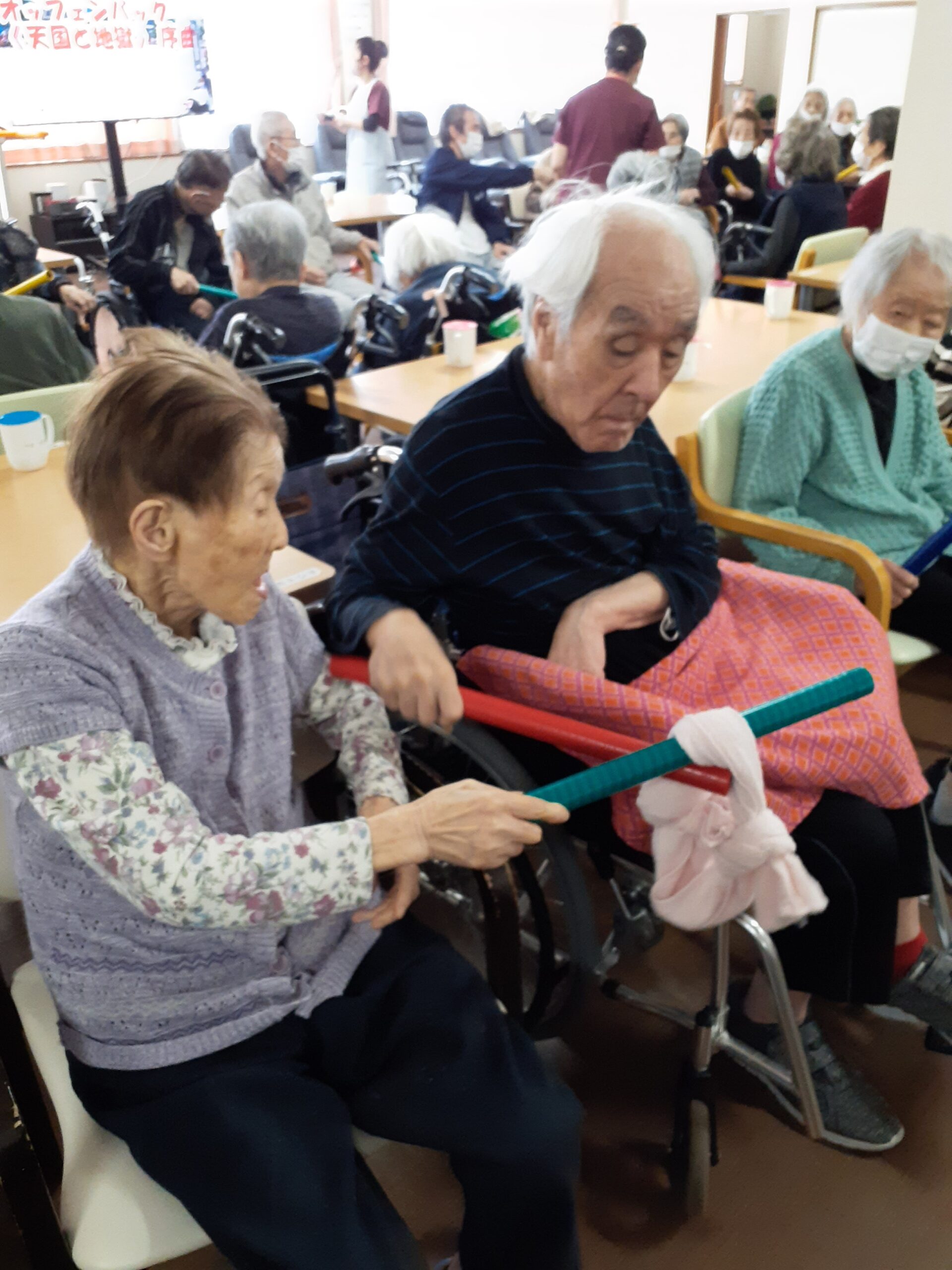 その後、一人ずつ棒を持ってタオルやボールを隣の方にお渡しするゲームをして皆さん大変楽しまれていました~🎵